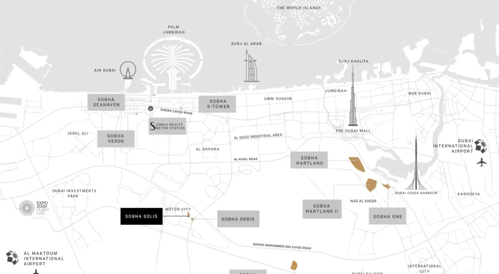 Situated in Dubai’s Motor City, Sobha Solis offers residents easy access to major city attractions and business centers. The development is well-connected to key highways, ensuring convenient travel throughout Dubai.